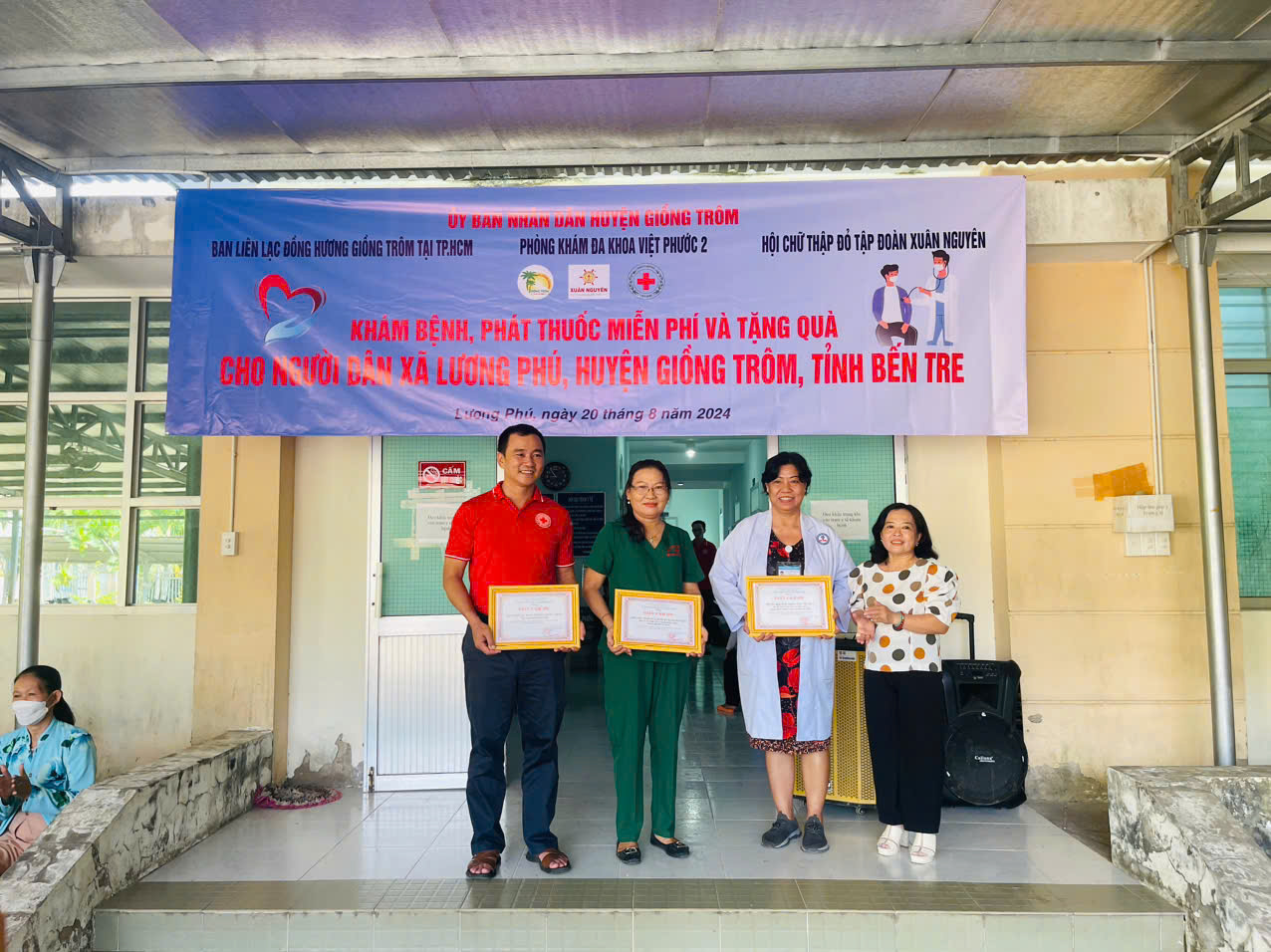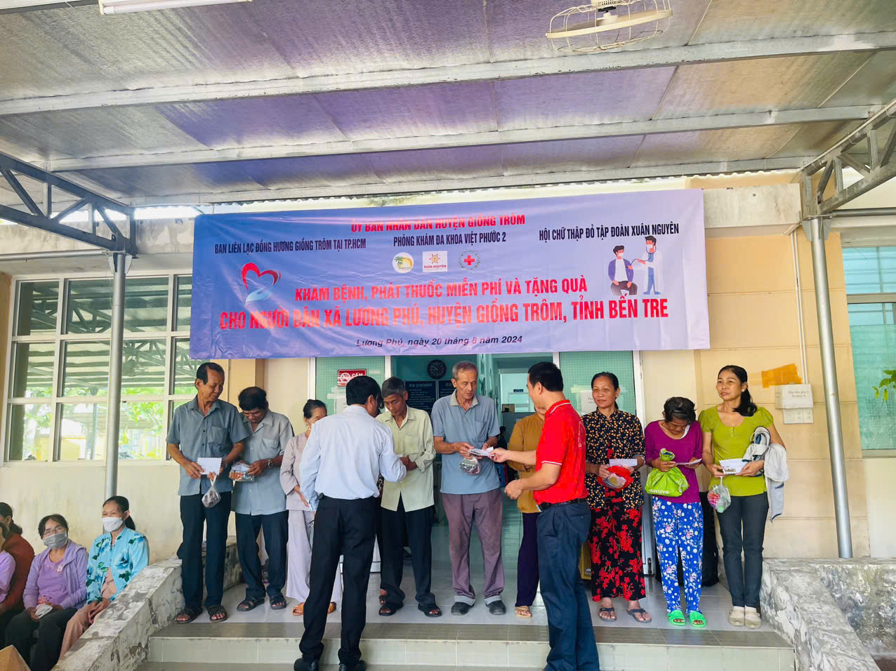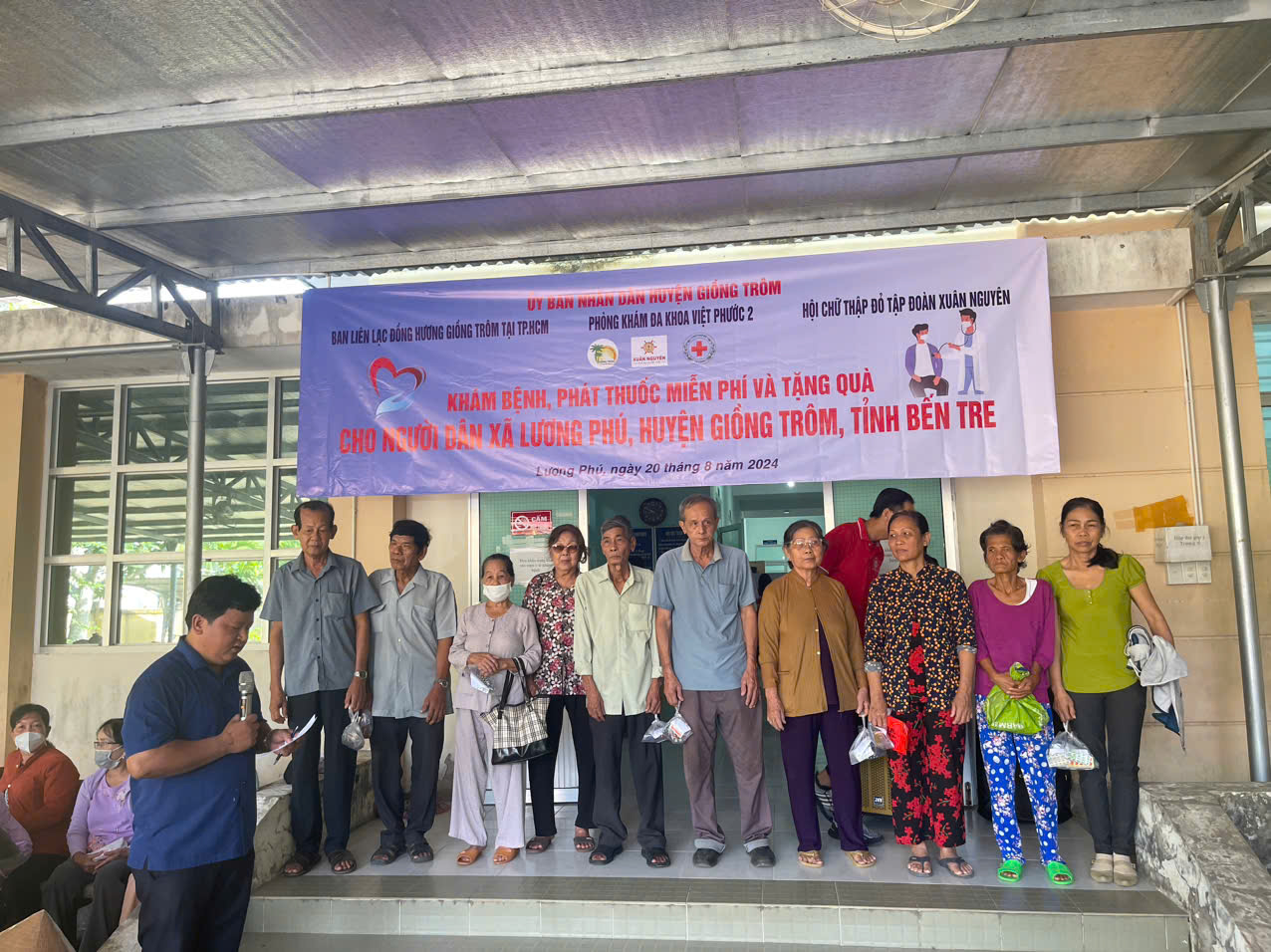 Ngày 20/8, Phòng khám đa khoa Việt Phước 2, huyện Bình Chánh, TP.HCM phối hợp với Ban liên lạc đồng hương Giồng Trôm tại TP.HCM cùng Hội chữ thập đỏ Tập đoàn Xuân Nguyên đã tổ chức khám bệnh và cấp thuốc miễn phí cho 150 bệnh nhân có hoàn cảnh khó khăn tại xã Lương Phú, huyện Giồng Trôm, tỉnh Bến Tre.     Theo đó, được sự chấp thuận của Sở Y tế tỉnh Bến Tre, UBND huyện Giồng Trôm. Sáng ngày 20/8, huyện Giồng Trôm đã vận động Hội Chữ thập đỏ Tập đoàn Xuân Nguyên tài trợ 100% kinh phí cùng phối hợp với Y, Bác sĩ Phòng khám Đa khoa Việt Phước 2 đến khám chữa bệnh cho 150 bệnh nhân tại xã Lương Phú.