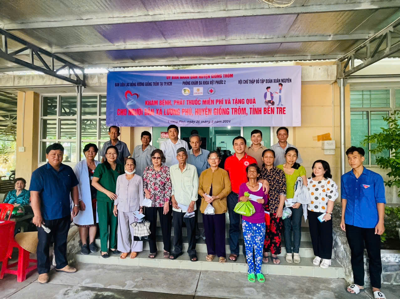 Ngày 20/8, Phòng khám đa khoa Việt Phước 2, huyện Bình Chánh, TP.HCM phối hợp với Ban liên lạc đồng hương Giồng Trôm tại TP.HCM cùng Hội chữ thập đỏ Tập đoàn Xuân Nguyên đã tổ chức khám bệnh và cấp thuốc miễn phí cho 150 bệnh nhân có hoàn cảnh khó khăn tại xã Lương Phú, huyện Giồng Trôm, tỉnh Bến Tre.     Theo đó, được sự chấp thuận của Sở Y tế tỉnh Bến Tre, UBND huyện Giồng Trôm. Sáng ngày 20/8, huyện Giồng Trôm đã vận động Hội Chữ thập đỏ Tập đoàn Xuân Nguyên tài trợ 100% kinh phí cùng phối hợp với Y, Bác sĩ Phòng khám Đa khoa Việt Phước 2 đến khám chữa bệnh cho 150 bệnh nhân tại xã Lương Phú.