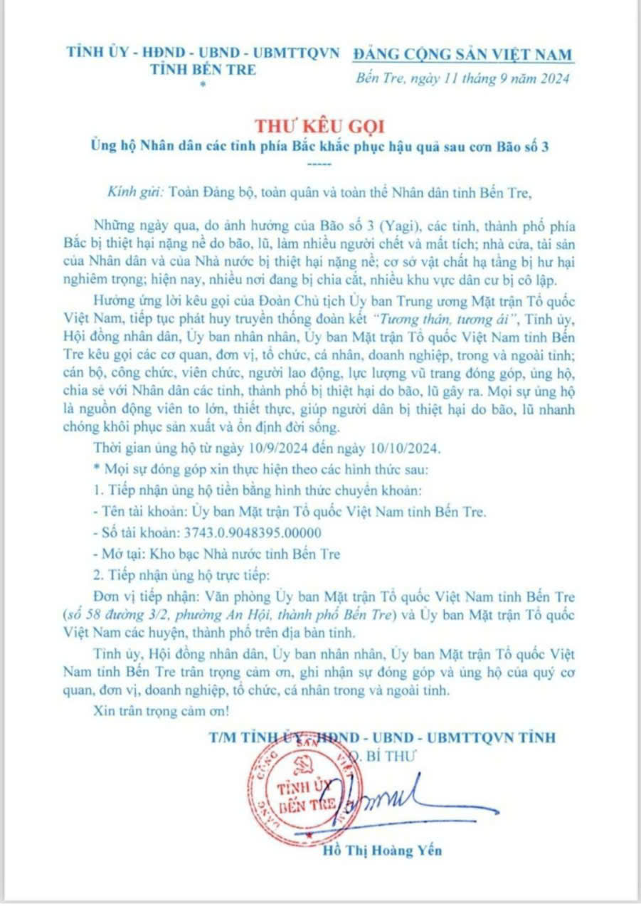 Đại diện Tỉnh ủy, Hội đồng nhân dân, Ủy ban nhân nhân, Ủy ban Mặt trận Tổ quốc Việt Nam tỉnh Bến Tre, quyền Bí thư bà Hồ Thị Hoàng Yến đã ký thư kêu gọi các cơ quan, đơn vị, tổ chức, cá nhân, doanh nghiệp, trong và ngoài tỉnh; cán bộ, công chức, viên chức, người lao động, lực lượng vũ trang đóng góp, ủng hộ, chia sẻ với Nhân dân các tỉnh, thành phố bị thiệt hại do bão, lũ gây ra.