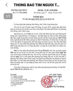 PHƯỜNG SƠN ĐÔNG (TỈNH VĨNH LONG): THÔNG BÁO TÌM NGƯỜI THÂN CỦA TRẺ BỊ BỎ RƠI