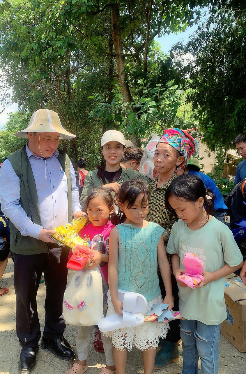 Hoa việc tốt Nguyễn Thị Hương và Trương Thị Thanh Nga, Đại diện Vạn Chài Green Eco, Hội đồng hương Kỳ Anh, Hà Tĩnh khu vực miền Nam trao quà cho bà con bị ảnh hưởng lũ lụt tại Thôn Ngải Trồ, bản A Mú Sung, Lào Cai