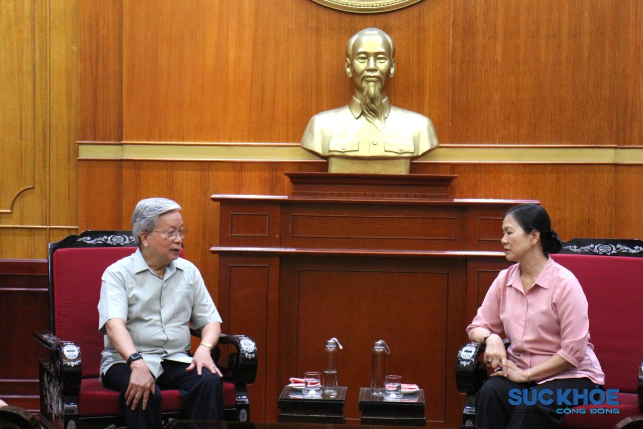 Ông Nguyễn Hồng Quân, Chủ tịch Hội GDCSSKCĐ Việt Nam trao đổi với bà Trương Thị Ngọc Ánh, Phó Chủ tịch Ủy ban Trung ương Mặt trận Tổ quốc Việt Nam tại buổi trao quà ủng hộ