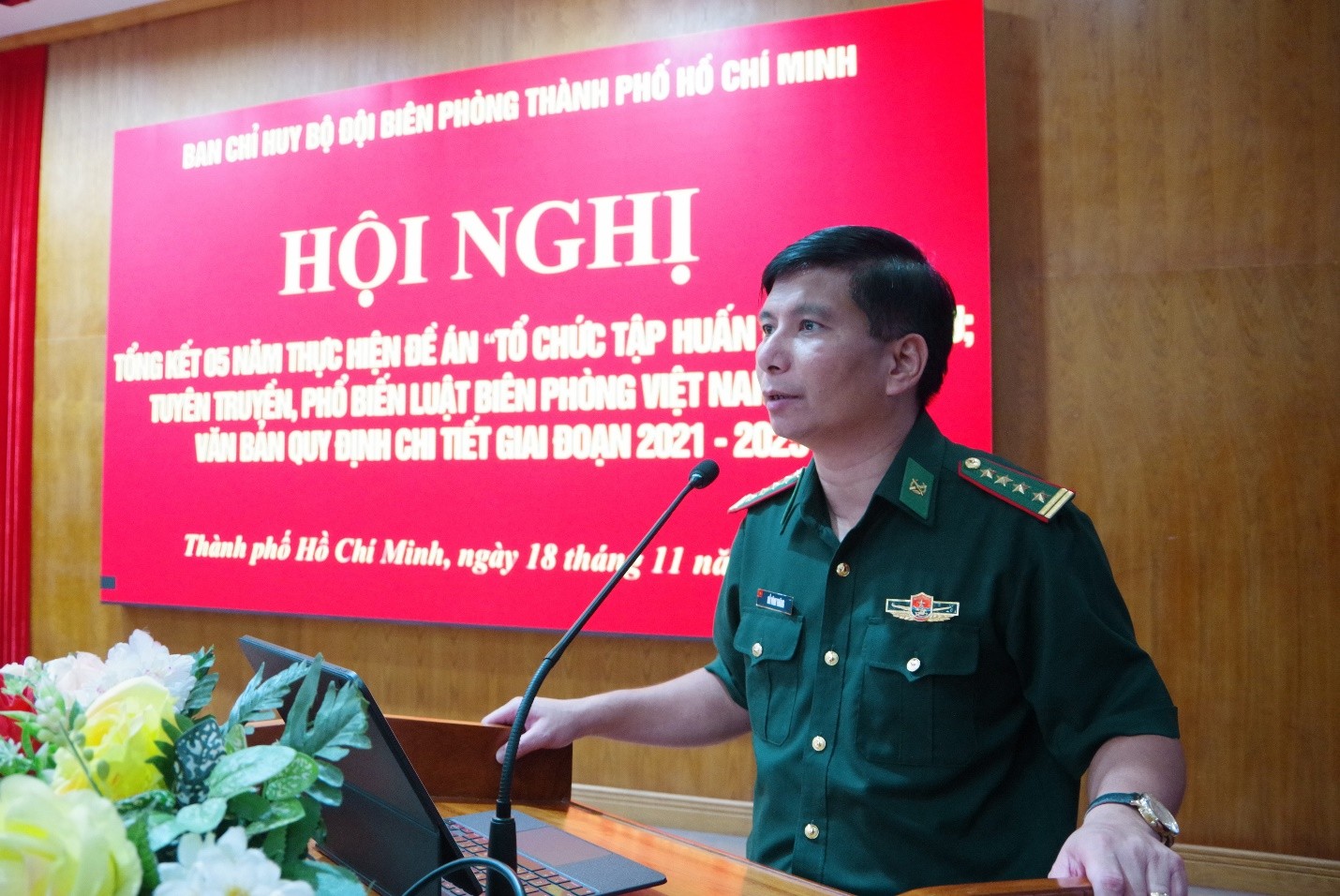 Phát biểu chỉ đạo tại Hội nghị, Đại tá Đỗ Vĩnh Thăng, Phó Chính uỷ Bộ Tư lệnh Thành phố kiêm Chính uỷ Ban Chỉ huy BĐBP Thành phố Hồ Chí Minh nhấn mạnh: Đề án tập huấn chuyên sâu Luật Biên phòng Việt Nam đã được triển khai nghiêm túc, bài bản, sáng tạo, đạt nhiều kết quả quan trọng, góp phần nâng cao nhận thức, trách nhiệm và năng lực thực thi pháp luật của cán bộ, chiến sĩ; tăng cường phối hợp giữa các lực lượng, cơ quan, ban, ngành, đoàn thể địa phương; tạo chuyển biến tích cực trong việc phổ biến, giáo dục pháp luật về biên giới quốc gia, quản lý, bảo vệ chủ quyền, an ninh biên giới, biển, đảo và cửa khẩu cảng của Thành phố.