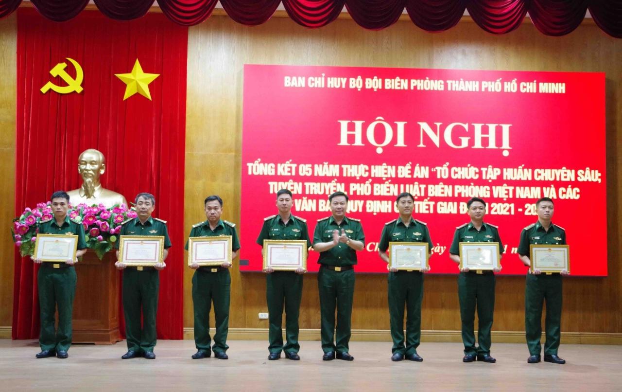 Đại tá Đỗ Vĩnh Thăng, Phó Chính uỷ Bộ Tư lệnh Thành phố kiêm Chính uỷ Ban Chỉ huy BĐBP Thành phố Hồ Chí Minh tặng giấy khen cho các tập thể đã có thành tích xuất sắc trong thực hiện Đề án “Tổ chức tập huấn chuyên sâu; tuyên truyền, phổ biến Luật Biên phòng Việt Nam và các văn bản quy định chi tiết giai đoạn 2021 – 2025”.