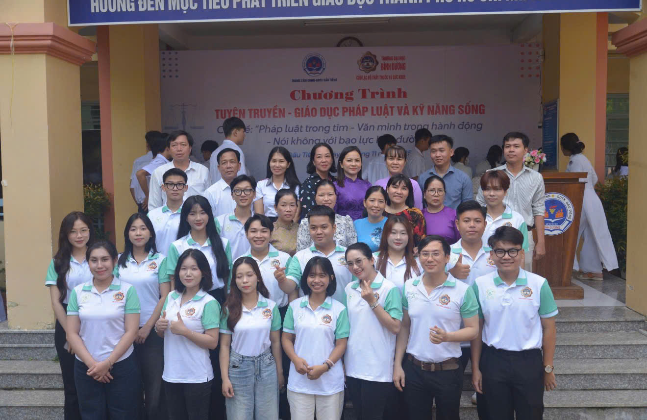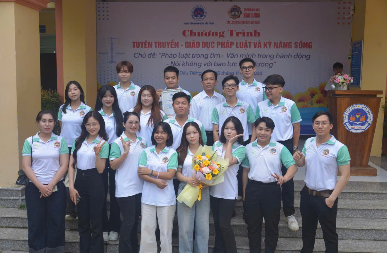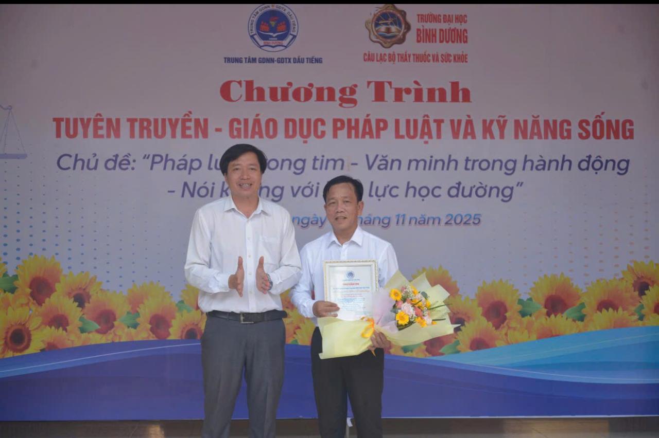 Sáng ngày 10/11/2025, trong không khí sôi nổi và đầy hứng khởi, Trung tâm Giáo dục nghề nghiệp – Giáo dục thường xuyên (GDNN–GDTX) Dầu Tiếng, Tp. Hồ Chí Minh phối hợp với Trường Đại học Bình Dương – Câu lạc bộ Thầy Thuốc và Sức khỏe tổ chức chương trình Tuyên truyền – Giáo dục pháp luật và kỹ năng sống với chủ đề: “Pháp luật trong tim – Văn minh trong hành động – Nói không với bạo lực học đường.”