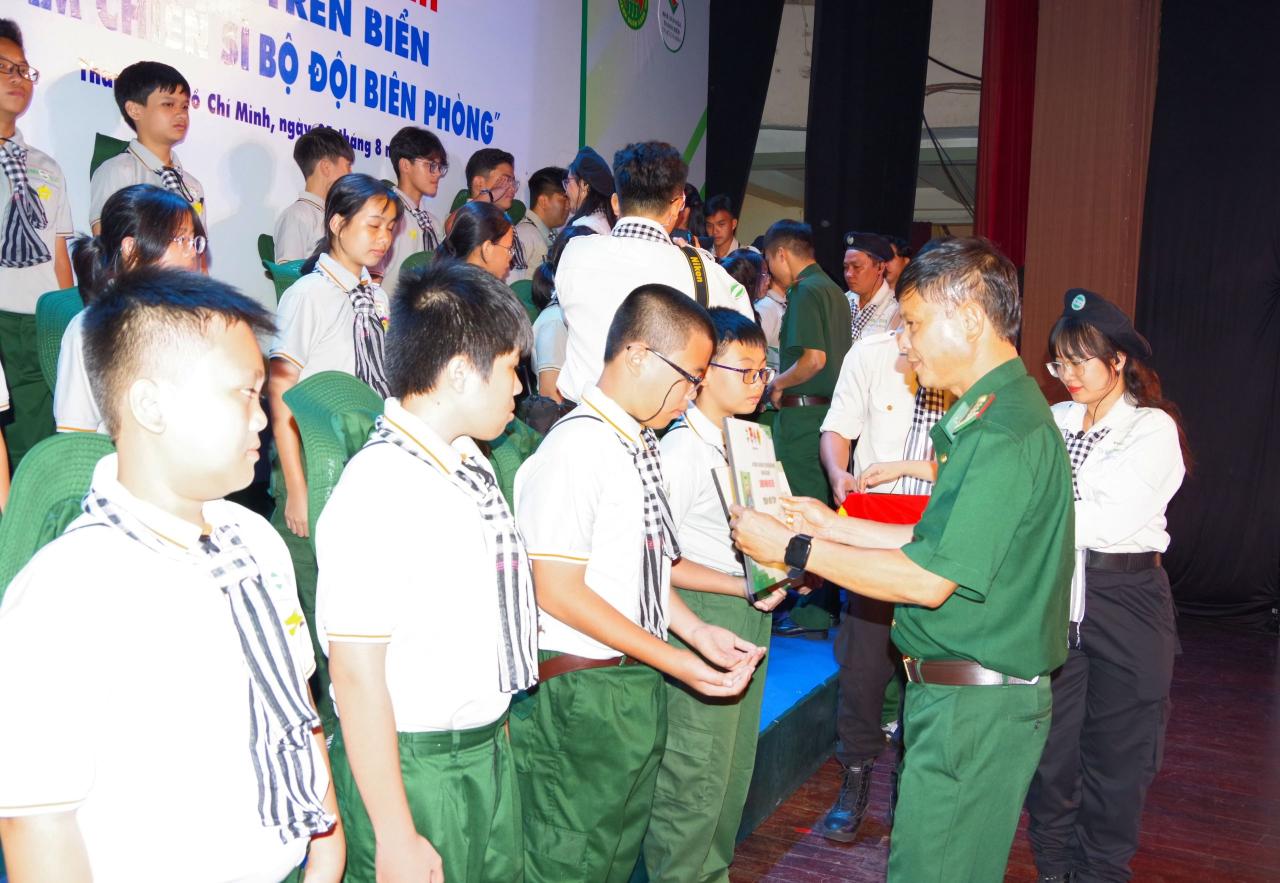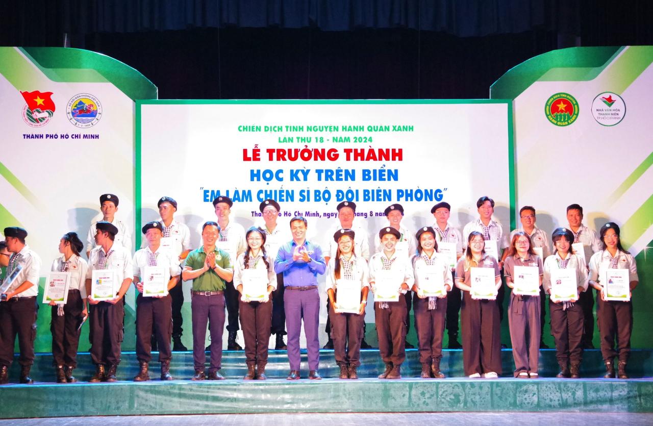 Đại tá Lâm Văn Huy,Ủy viên Ban Thường vụ, Chủ nhiệm Chính trị Bộ đội Biên phòng Thành phố Hồ Chí Minh; Đồng chí Trần Huỳnh Nam Phương, Cán bộ văn phòng Hội liên hiệp Thanh niên Việt Nam Thành phố trao chứng nhận cho các cháu.