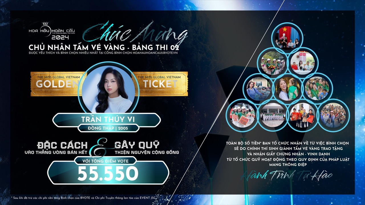 Trần Thúy Vi (sinh năm 2005, Đồng Tháp) hiện đang là thí sinh được nhiều người bình chọn nhất bảng thi 02 (tại nền tảng BVOTE Hoa hậu Hoàn cầu Việt Nam 2024) và xuất sắc giành tấm vé vàng vào thẳng vòng Bán kết sẽ diễn ra tại Thành phố Hồ Chí Minh.