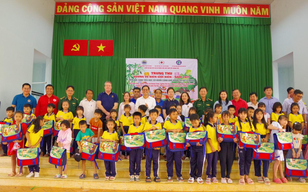 Đoàn công tác trao tặng xe đạp cho các cháu trong Chương trình “Nâng bước em tới trường”.