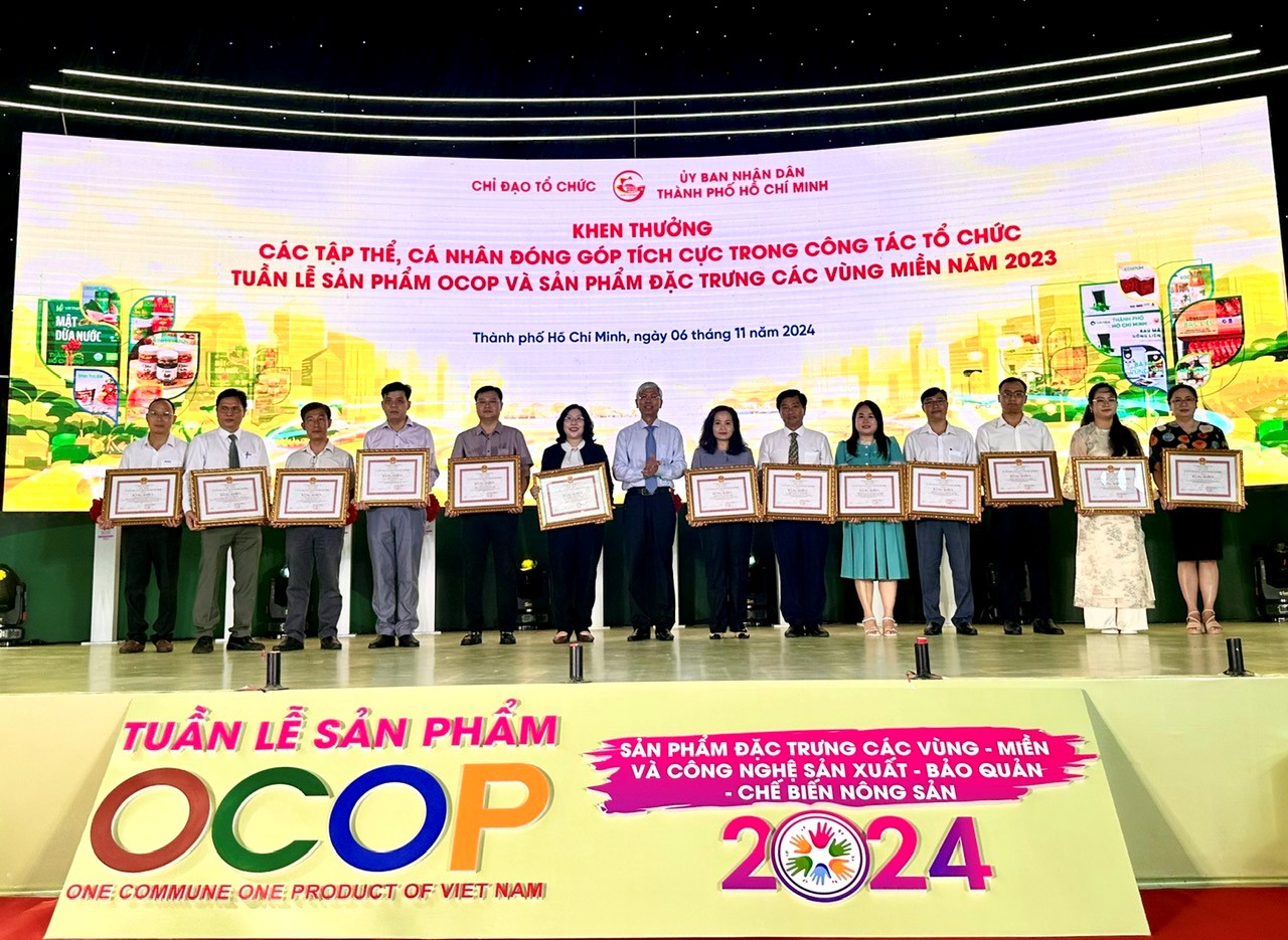 Sáng nay, ngày 6/11 diễn ra lễ khai mạc tuần lễ sản phẩm OCOP, sản phẩm đặc trưng các vùng – miền và công nghệ sản xuất – bảo quản – chế biến nông sản năm 2024 tại Công viên văn hoá Lê Thị Riêng, quận 10, TP.HCM . Tuần lễ sản phẩm OCOP trưng bày, giới thiệu gần 1.000 sản phẩm của hơn 320 doanh nghiệp, hợp tác xã đến từ 32 tỉnh thành trên cả nước. Sự kiện do Sở Nông nghiệp và Phát triển nông thôn Tp. Hồ Chí Minh phối hợp với các địa phương tổ chức.