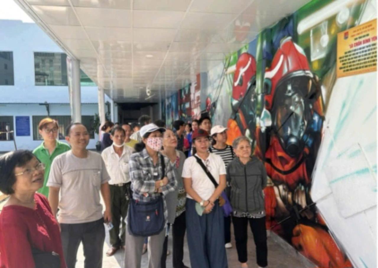 Người dân tham quan bức bích họa “Lá chắn bình yên” tại Phòng PC07 – Công an Thành phố Hồ Chí Minh