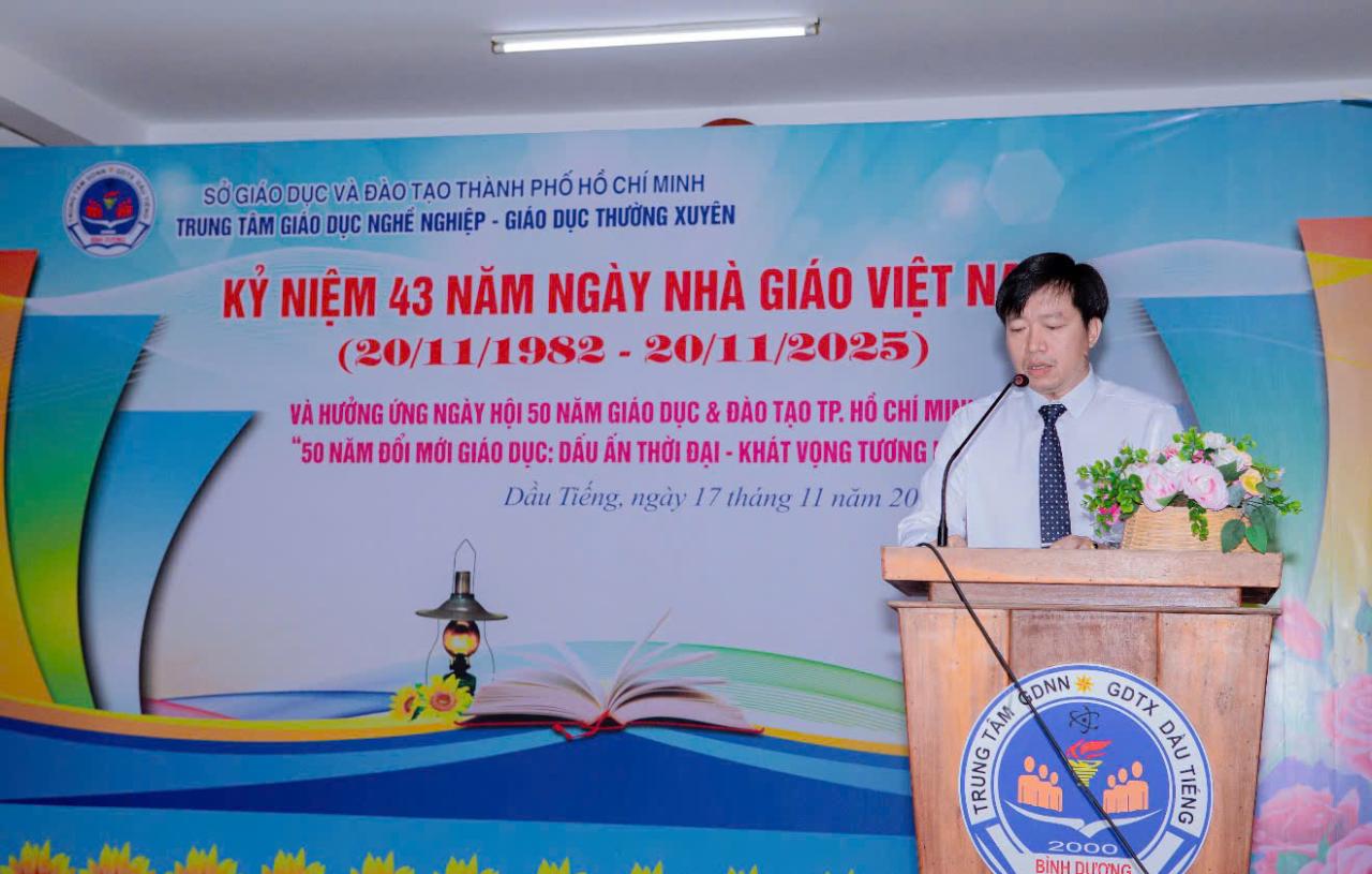 Thầy Nguyễn Văn Giáp nhấn mạnh, với mô hình giáo dục mở, linh hoạt, Trung tâm GDNN–GDTX Dầu Tiếng đặc biệt có ý nghĩa đối với các học viên có hoàn cảnh khó khăn, người đi làm muốn học nghề, hoặc những em còn hạn chế điều kiện tiếp cận giáo dục chính quy. Tại đây, mỗi thầy cô không chỉ truyền đạt kiến thức mà còn khơi dậy nghị lực, nuôi dưỡng ước mơ và tạo cơ hội học tập suốt đời cho người học. Cũng tại buổi lễ, Trung tâm chính thức phát động hưởng ứng Ngày hội 50 năm ngành GD&ĐT TP.HCM – một dấu ấn quan trọng mở ra nhiều cơ hội kết nối, đổi mới và học hỏi cho đội ngũ nhà giáo trong bối cảnh chuyển đổi số mạnh mẽ hiện nay.